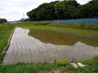 ・側溝に溜まったゴミを取り除く ・田植えを終えたばかりの早苗が初夏の雰囲気