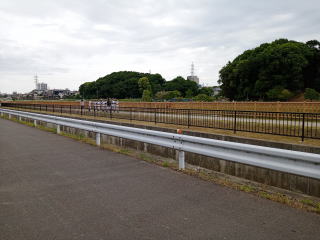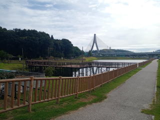 河合池のシンボルツリー、晩白柚(ばんぺいゆ) ウォーキングロードからアローブリッジを望む